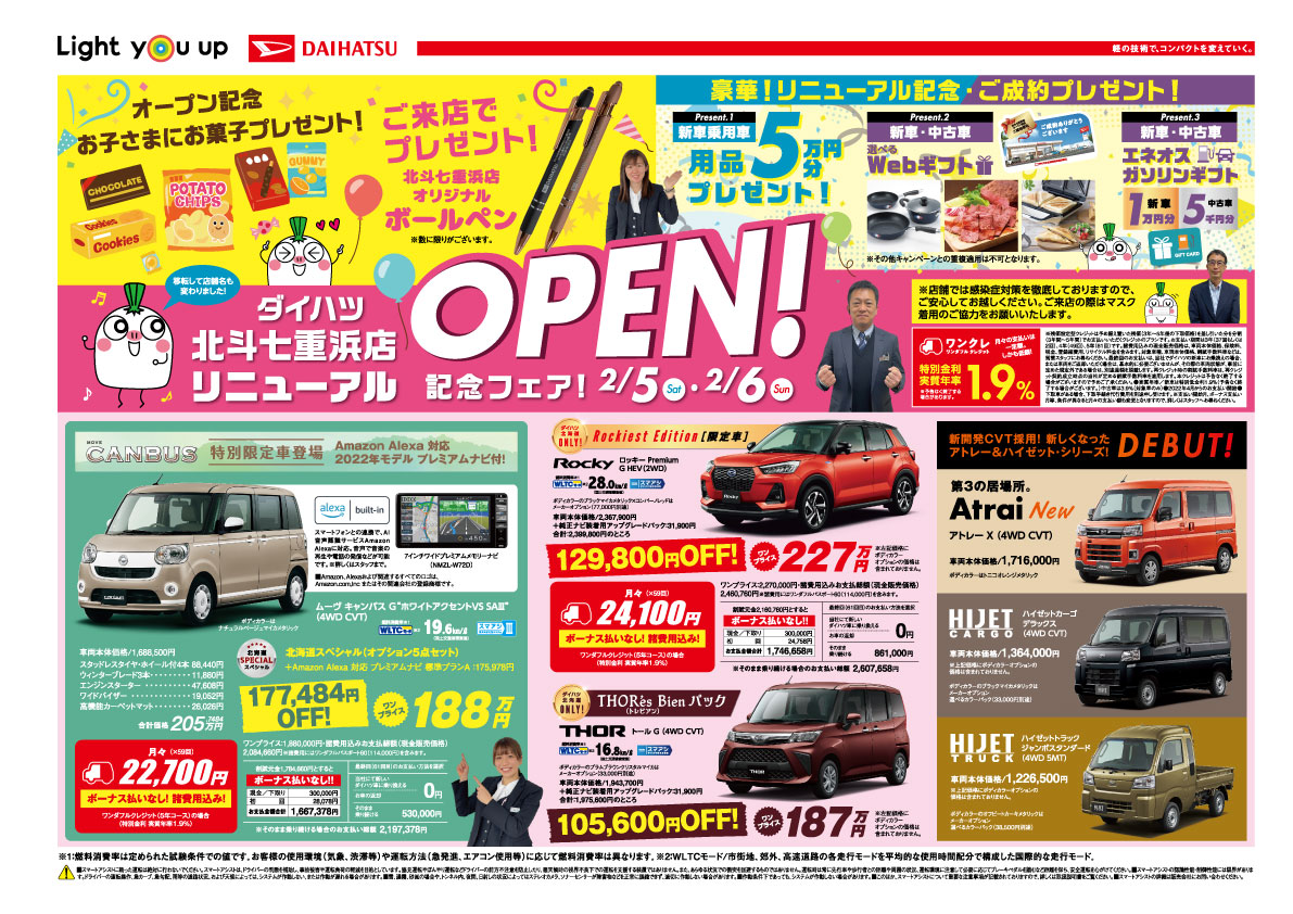 【イベント終了】北斗七重浜店オープンイベント開催!新車も中古車も、ご成約特典がついてお得!詳しくはこちらをご確認ください!