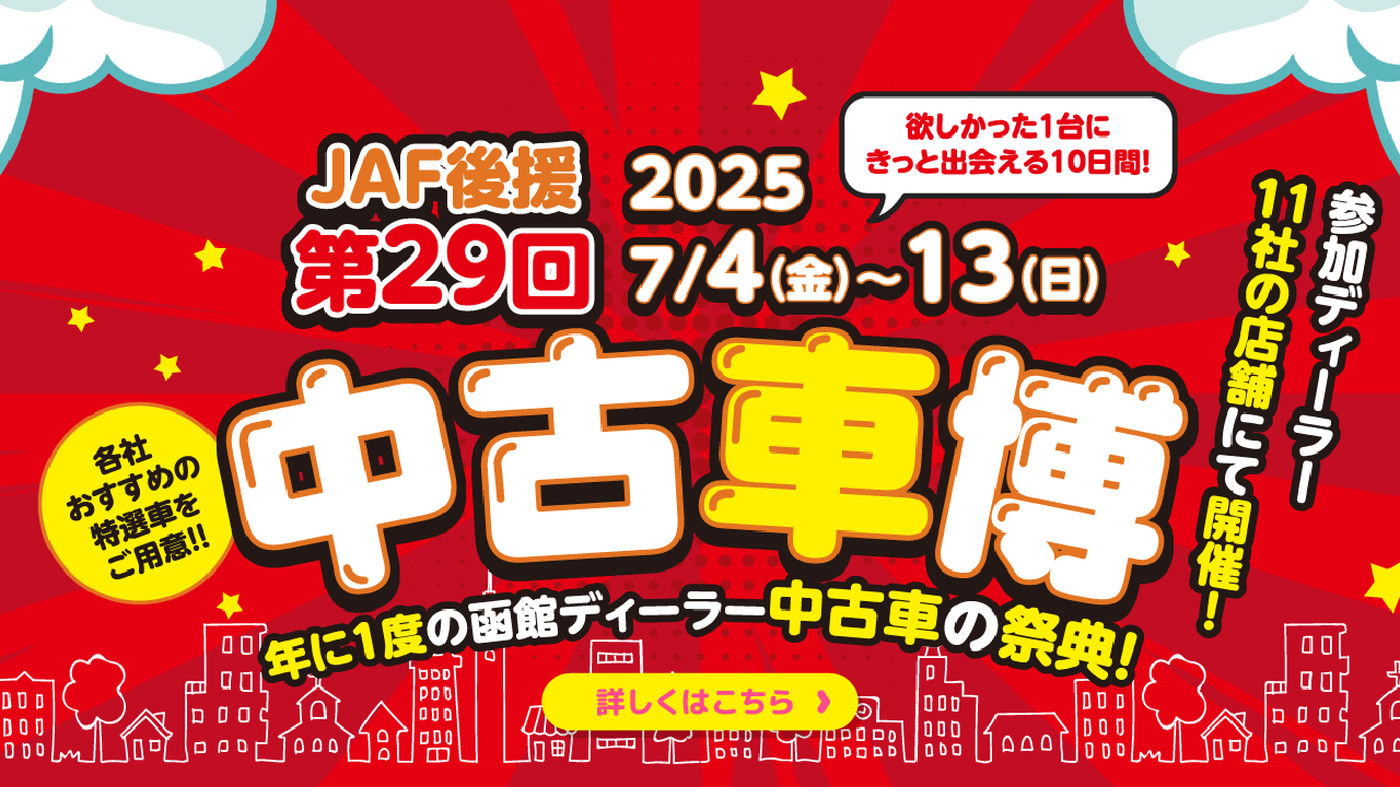 【イベント終了】7月4日(金)~13日(日) 第29回函館中古車博を開催!年に一度の函館ディーラー中古車の祭典!是非お越しください!