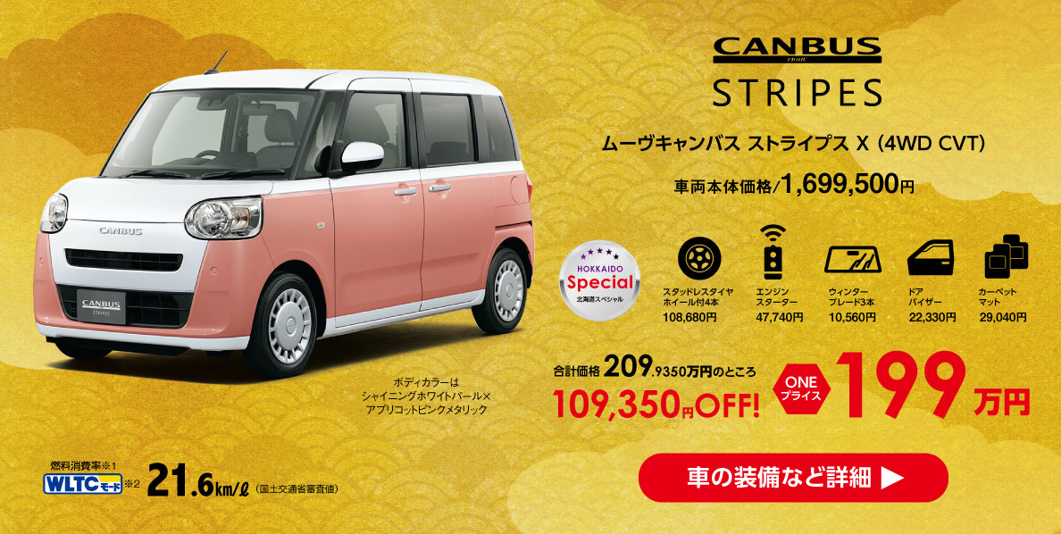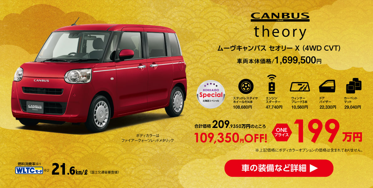 ダイハツ北海道販売限定のワンプライスCarです。北海道の冬に欠かせない、スタッドレスタイヤ・ウィンターブレード・エンジンスターターに加え、ドアバイザーとカーペットマットも付いてお得にご購入いただけます!