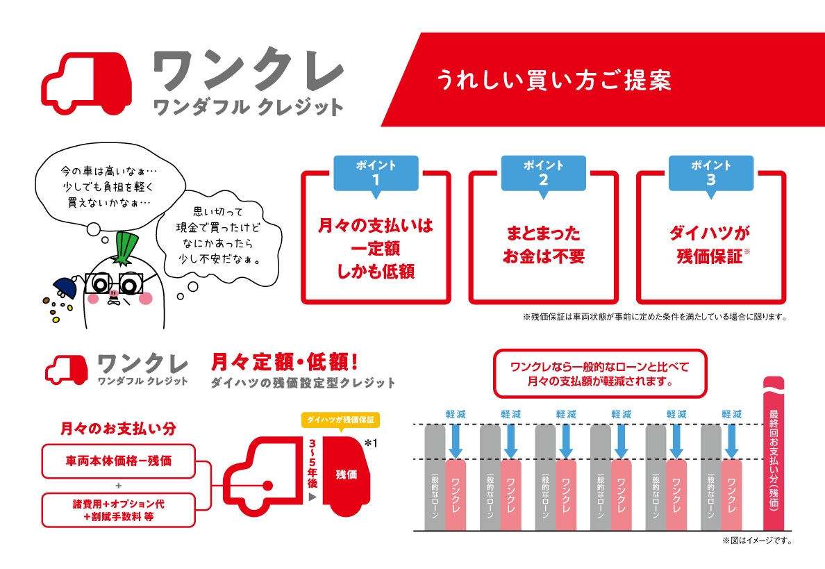 お支払い期間は3年(37回もしくは2回)、4年(49回もしくは2回)、5年(61回もしくは2回)です。諸費用込みの現金販売価格は、車両本体価格、保険料、税金、登録諸費用、リサイクル料金を含みます。対象車種、車両本体価格、割賦手数料率などは、営業スタッフにお尋ねください。最終回のお支払いは、当社でダイハツの新車にお乗換えの場合、または車両をご返却いただく場合は、基本的に必要ございませんが、その際の車両状態が、事前に定めた規定外である場合は、別途差額を頂戴します。再クレジット時の割賦手数料率は、再クレジット契約成立時点の当社が定める割賦手数料率を適用します。本クレジットは予告なく終了する場合がございますので予めご了承ください。