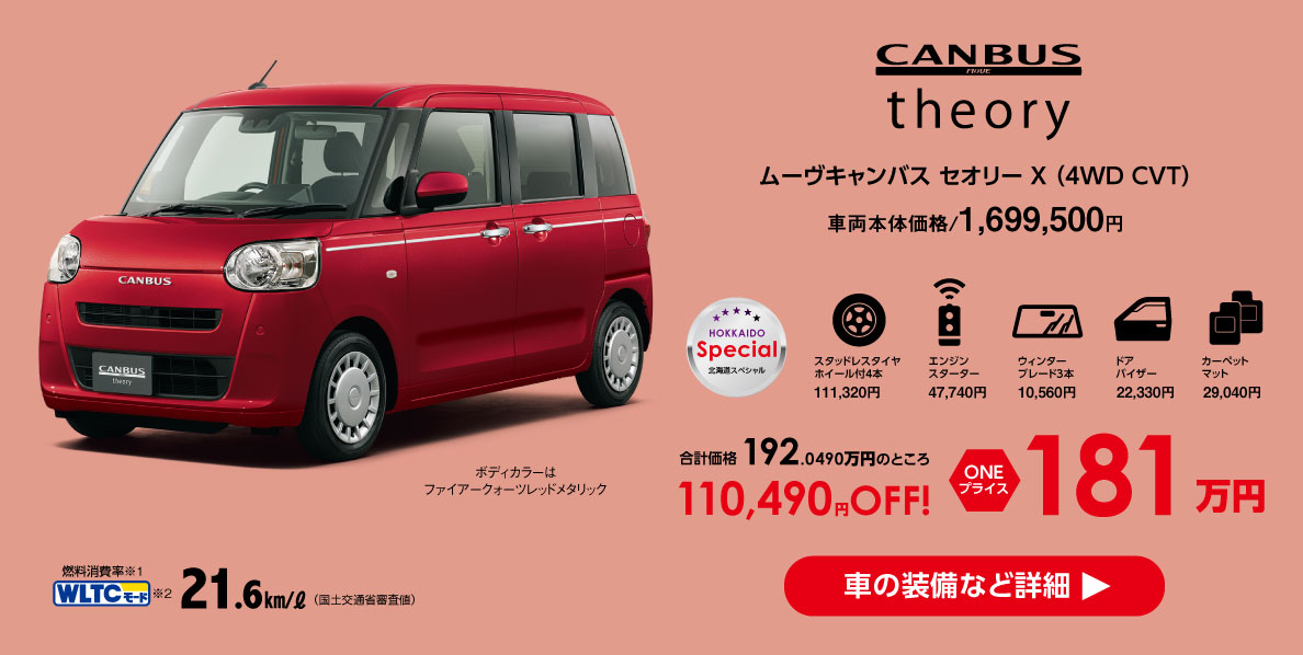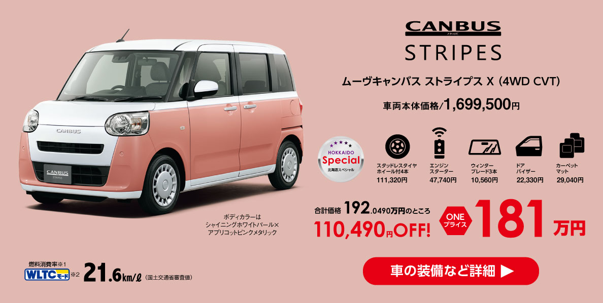 ダイハツ北海道販売限定のワンプライスCarです。北海道の冬に欠かせない、スタッドレスタイヤ・ウィンターブレード・エンジンスターターに加え、ドアバイザーとカーペットマットも付いてお得にご購入いただけます!