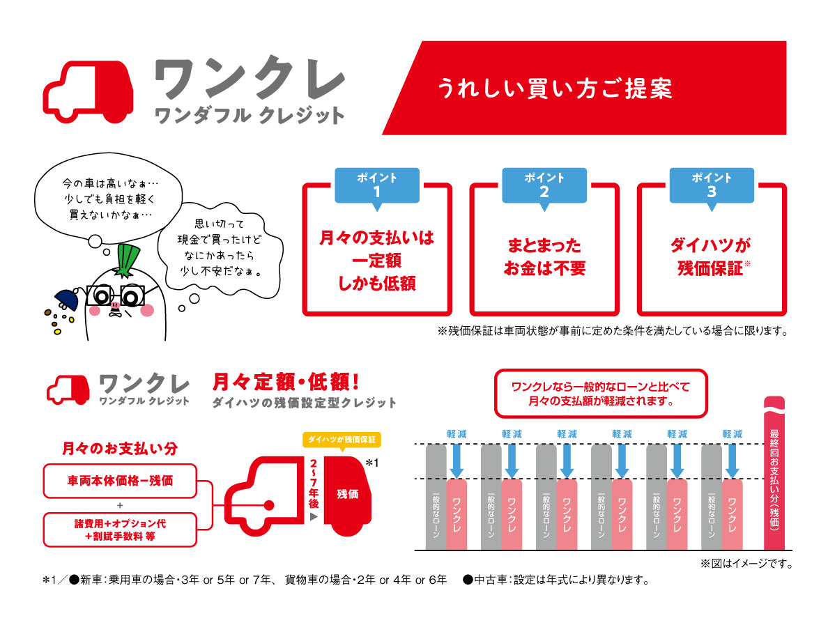 ※残価設定型クレジットは予め据え置いた残価(2年~7年後の下取価格)を差し引いた分を分割(2年間~7年間)でお支払いいただくクレジットのプランです。お支払い期間は2年(24回もしくは2回)、3年(36回もしくは2 回)、4年(48回もしくは2回)、5年(60回もしくは2回)、7年(84回)です。諸費用込みの現金販売価格は、車両本体価格、保険料、税金、登録諸費用、リサイクル料金を含みます。対象車種、車両 本体価格、割賦手数料率などは、営業スタッフにお尋ねください。最終回のお支払いは、当社でダイハツの新車にお乗換えの場合、または車両をご返却いただく場合は、基本的に必要ございません が、その際の車両状態が、事前に定めた規定外である場合は、別途差額を頂戴します。再クレジット時の割賦手数料率は、再クレジット契約成立時点の当社が定める割賦手数料率を適用します。 本クレジットは予告なく終了する場合がございますので予めご了承ください。