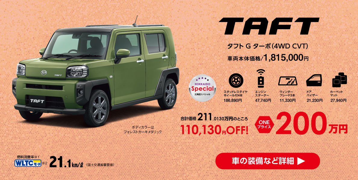 ダイハツ北海道販売限定のワンプライスCarです。北海道の冬に欠かせない、スタッドレスタイヤ・ウィンターブレード・エンジンスターターに加え、ドアバイザーとカーペットマットも付いてお得にご購入いただけます!