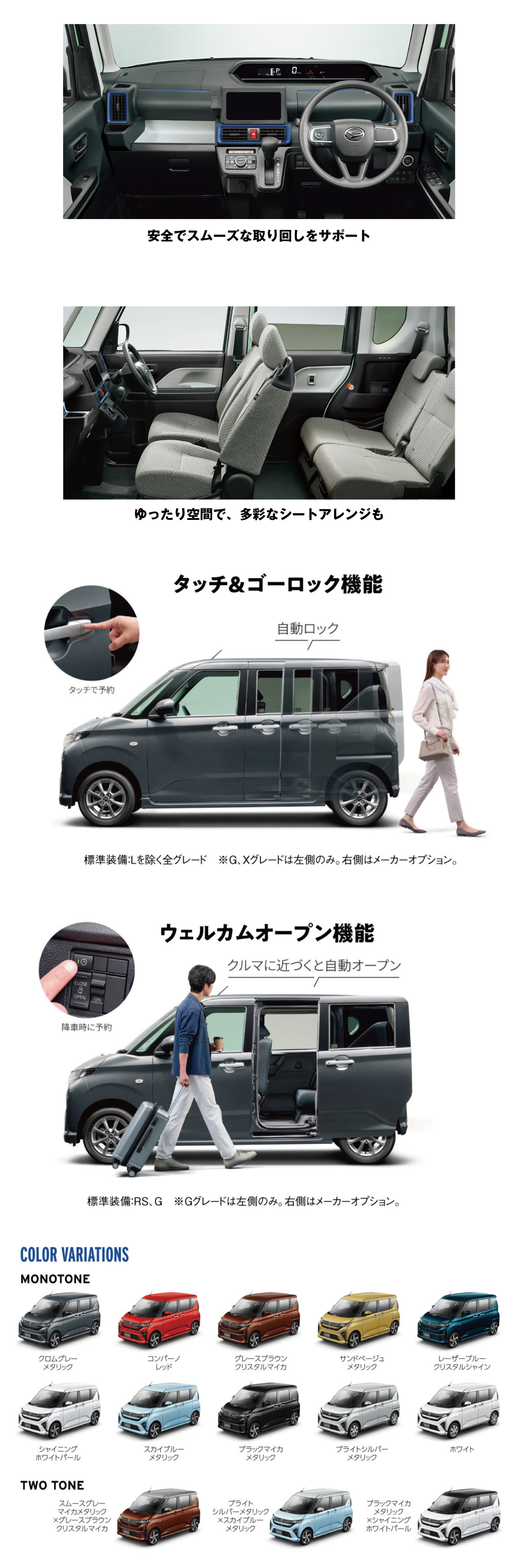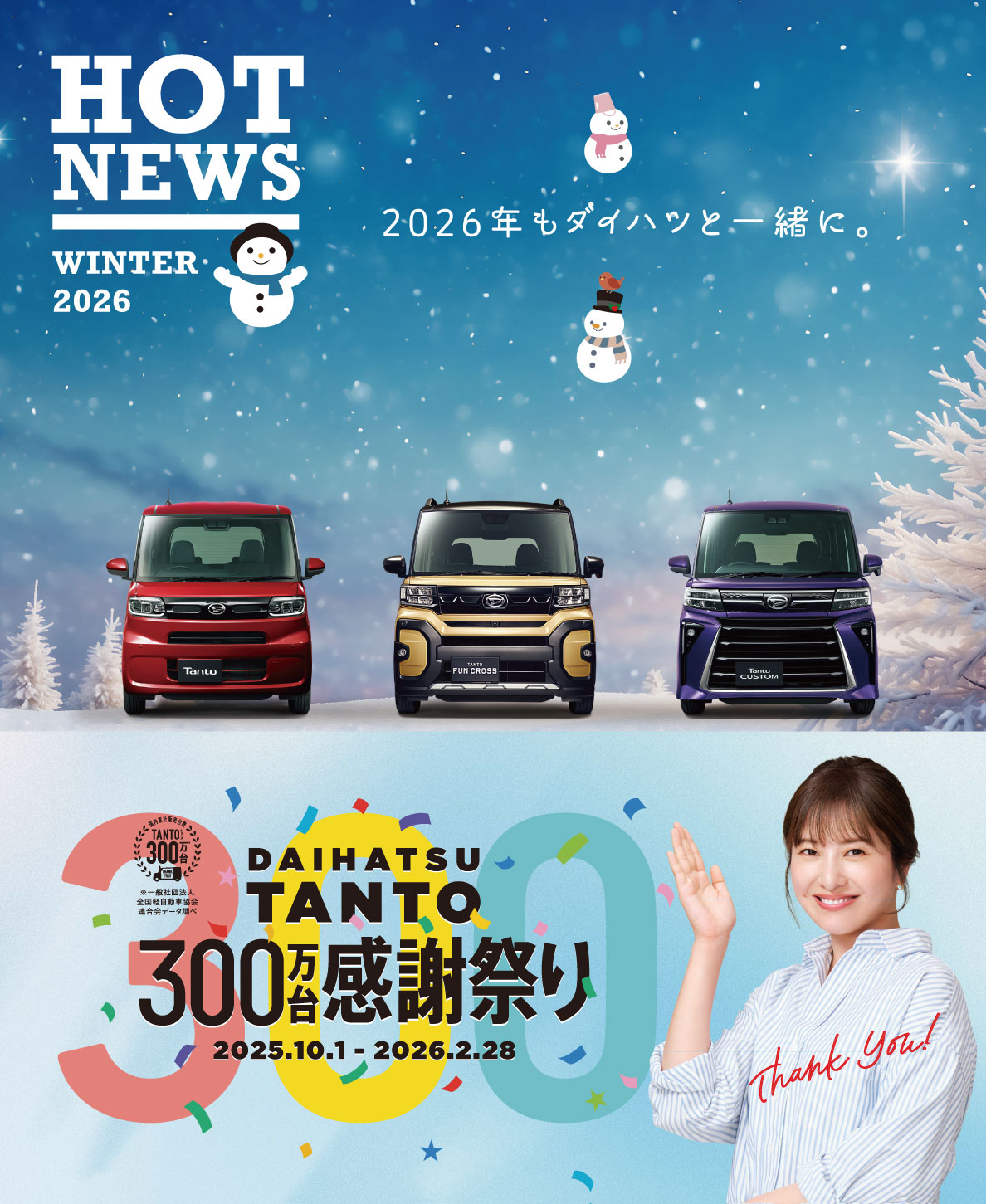 ※残価設定型クレジットは予め据え置いた残価(2年~7年後の下取価格)を差し引いた分を分割(2年間~7年間)でお支払いいただくクレジットのプランです。お支払い期間は2年(24回もしくは2回)、3年(36回もしくは2 回)、4年(48回もしくは2回)、5年(60回もしくは2回)、7年(84回)です。諸費用込みの現金販売価格は、車両本体価格、保険料、税金、登録諸費用、リサイクル料金を含みます。対象車種、車両 本体価格、割賦手数料率などは、営業スタッフにお尋ねください。最終回のお支払いは、当社でダイハツの新車にお乗換えの場合、または車両をご返却いただく場合は、基本的に必要ございません が、その際の車両状態が、事前に定めた規定外である場合は、別途差額を頂戴します。再クレジット時の割賦手数料率は、再クレジット契約成立時点の当社が定める割賦手数料率を適用します。 本クレジットは予告なく終了する場合がございますので予めご了承ください。