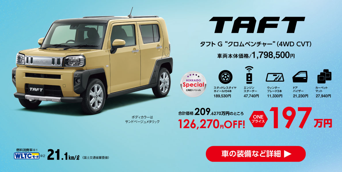 ダイハツ北海道販売限定のワンプライスCarです。北海道の冬に欠かせない、スタッドレスタイヤ・ウィンターブレード・エンジンスターターに加え、ドアバイザーとカーペットマットも付いてお得にご購入いただけます!