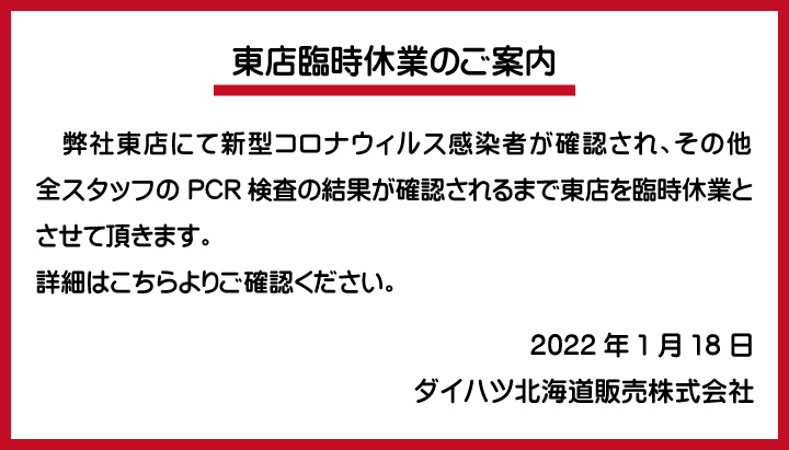 【1/18 東店臨時休業】東店スタッフの新型コロナウィルス感染について