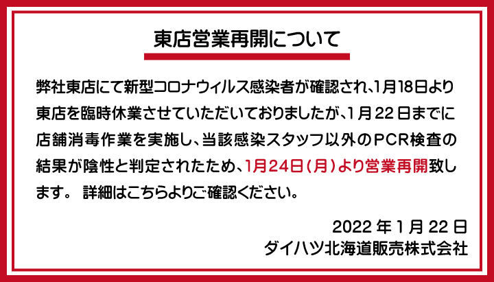 【1/24 東店営業再開】東店スタッフの新型コロナウィルス感染について