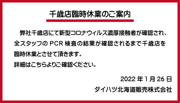 【1/26 千歳店臨時休業】コロナウィルス濃厚接触者について