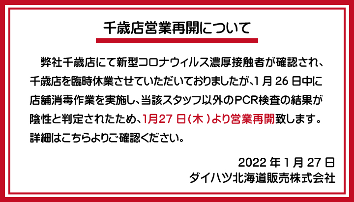 【1/27 千歳店営業再開】千歳店消毒・検査完了について