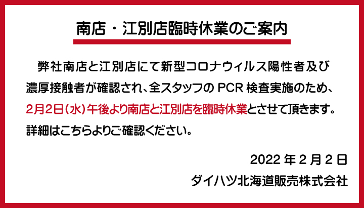 【2/2 南店・江別店臨時休業】コロナウィルス陽性者・濃厚接触者について