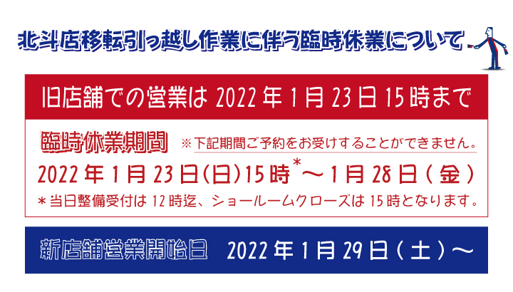 北斗店移転引っ越し作業のため、1月23日15時~1月28日まで臨時休業となります。詳しくはこちらをご確認ください。