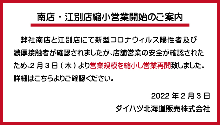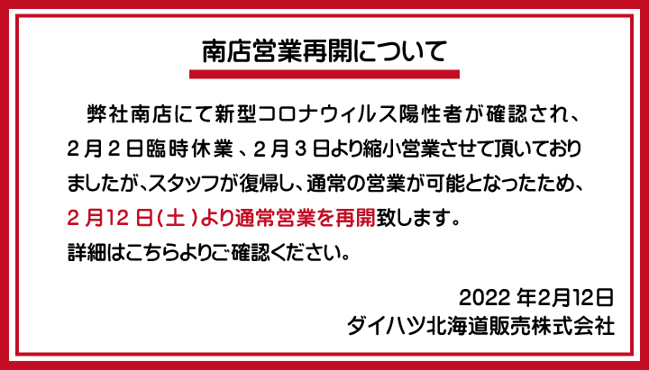 【2/3 南店・江別店営業再開】最少人数での営業再開となります