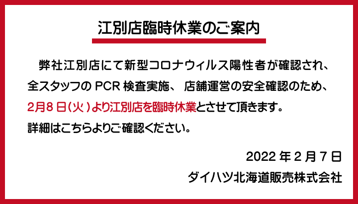 【2/7 江別店臨時休業】コロナウィルス陽性者について