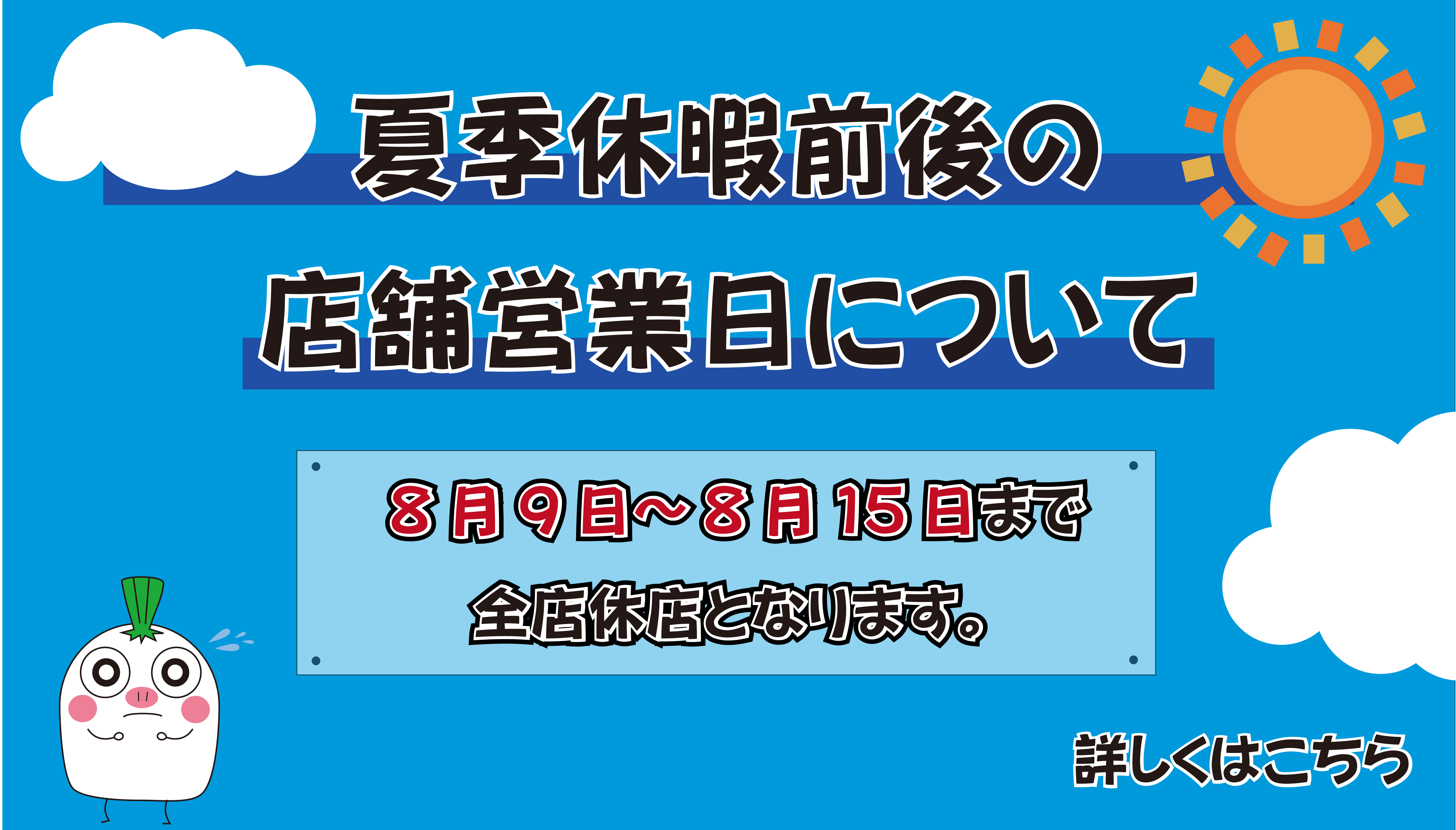 夏季休暇のためは8月9日から8月15日まで全店休店となります。