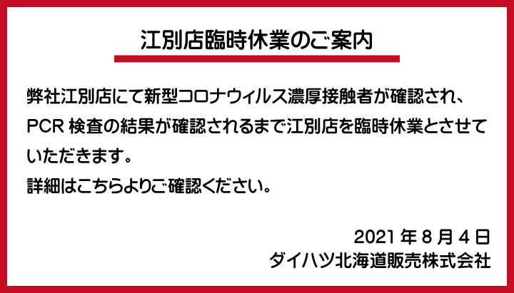 【8/4江別店臨時休業】江別店スタッフの新型コロナウィルス濃厚接触者について