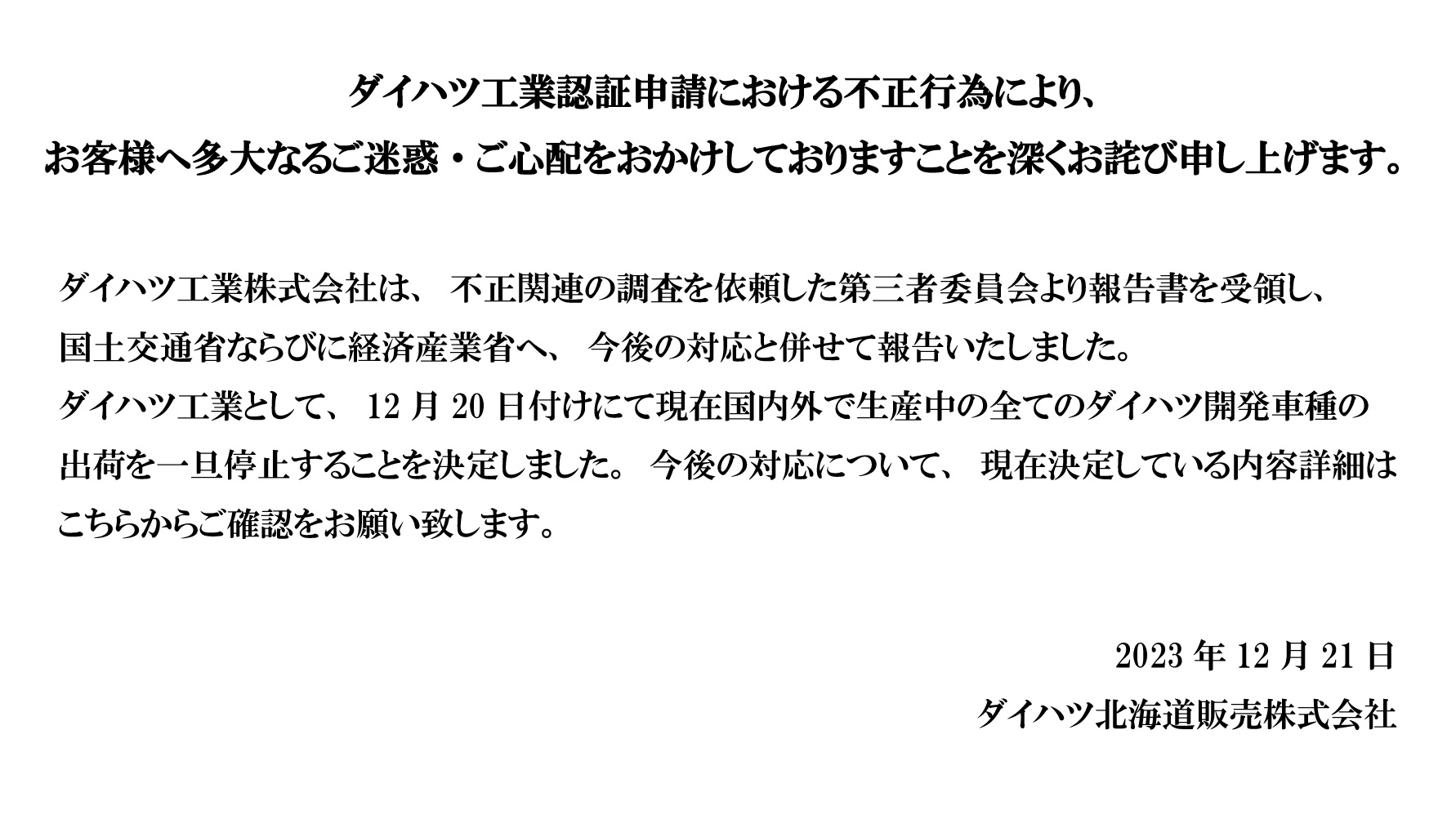 ダイハツ工業認証申請における不正行為により、お客様へ多大なるご迷惑・ご心配をおかけしておりますことを深くお詫び申し上げます。第三者委員会による調査結果、および今後のご対応についてはこちらよりご参照ください。