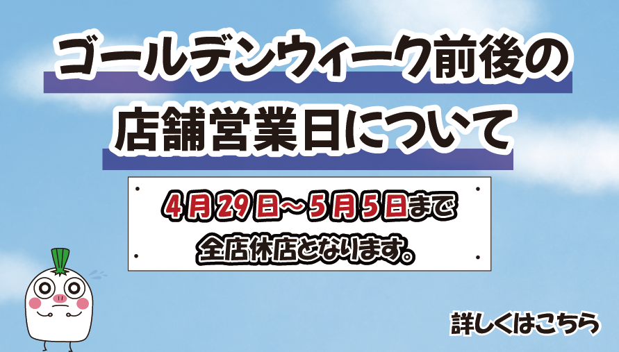 ゴールデンウィークは4月29日から5月5日まで全店休店となります。