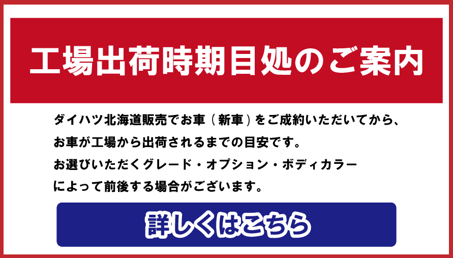 ダイハツ東店工場リニューアル工事終了に伴う店舗移転・臨時休業のご案内です。詳しくはこちらをご覧ください。