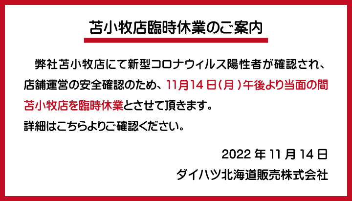 【11/14 苫小牧店臨時休業】コロナウィルス陽性者について