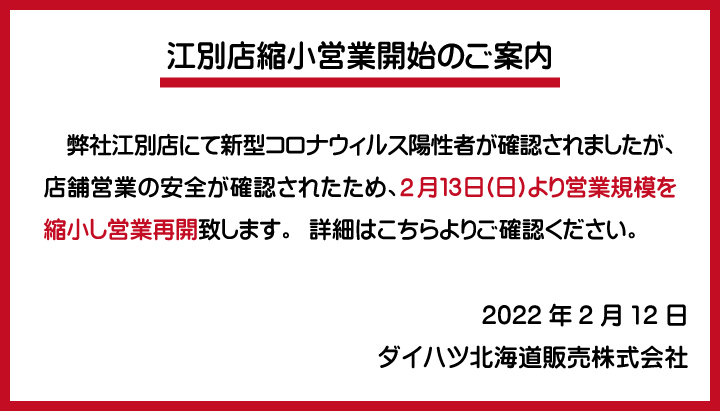 【2/12 江別店営業再開】最少人数での営業再開となります