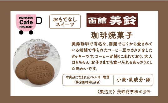 函館の老舗珈琲店【美鈴珈琲】さまの<珈琲焼菓子>をご用意しております。サクッとした舌ざわり、風味もお子様が食べやすいあっさりとした味わいです。ドリンクコーナーにご用意しておりますので、ご自由にお取りいただき、お召し上がりください。☕