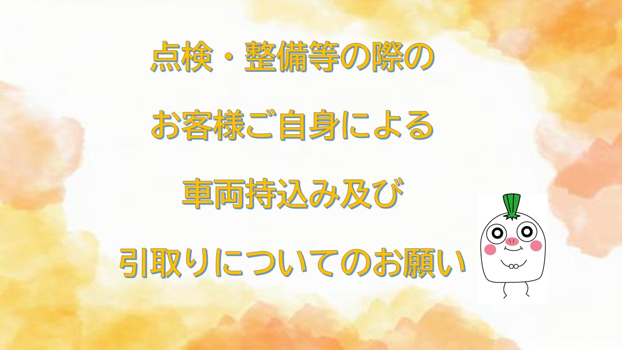 つきましては、お客様各位には大変お手数をおかけすることとなりますが、点検、整備などの際には、お客様ご自身により車両の持込み及び引取りを行っていただきますよう、お願い致します。なお、お客様のお車の引取り及び納車を行った場合は、誠に勝手ながら料金を請求する場合もございます。お客様によるお車の持込み及び引取りについて何卒ご理解いただき、今後とも変わらぬご愛顧を賜りますよう、よろしくお願い申し上げます。