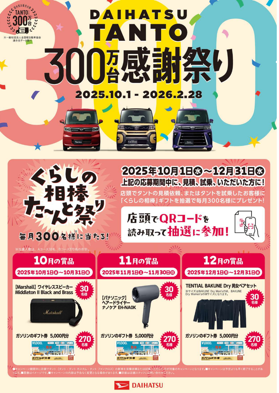 店頭でタントの試乗、または見積もり依頼いただいたお客様にワイヤレススピーカーをはじめとした「くらしの相棒」ギフトを抽選で毎月300名様にプレゼント🎁