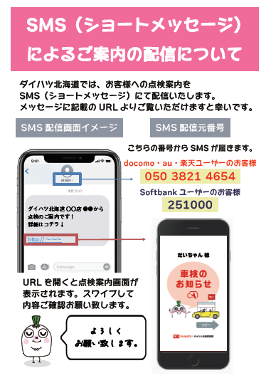 お客様への点検案内をSMS(ショートメッセージ)にて配信しております。