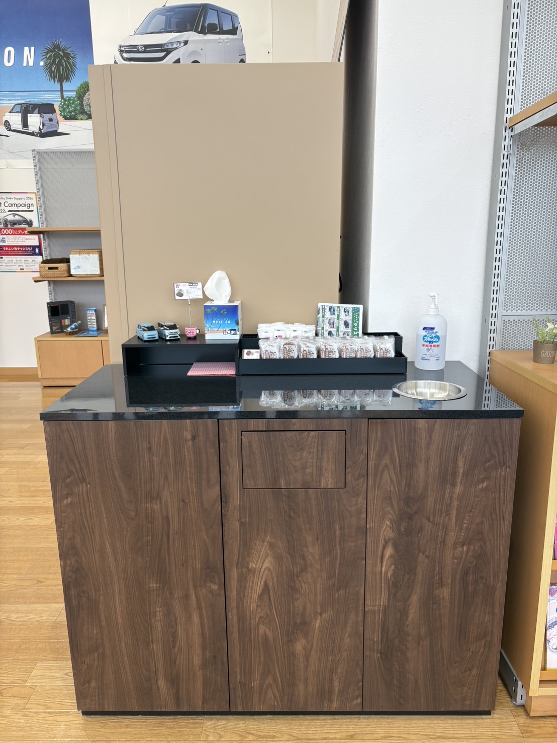 自販機右横の方に、季節ごとに変わるウェルカムスイーツもご用意しておりますのでカフェのようにごゆっくりおくつろぎください🍀