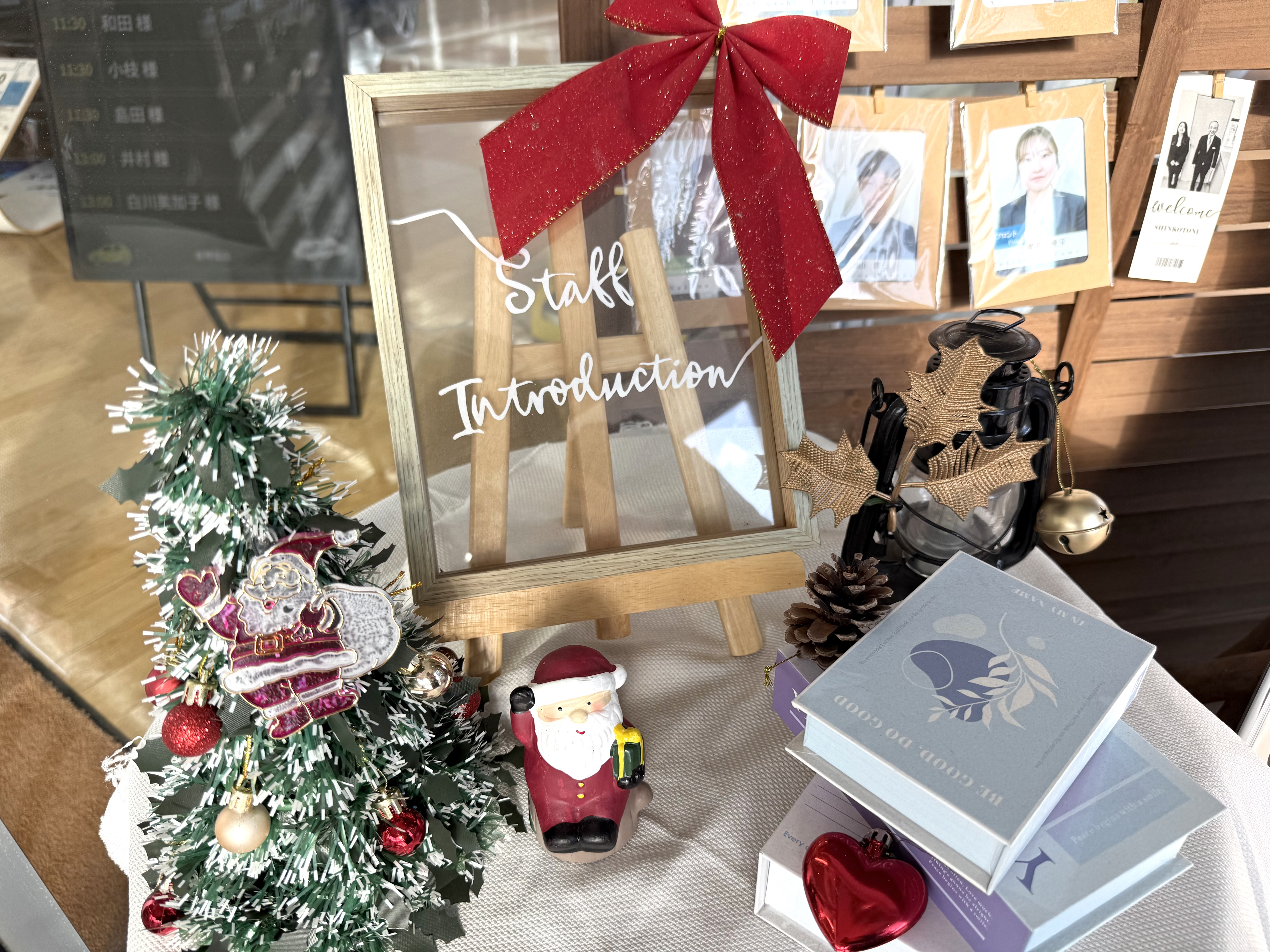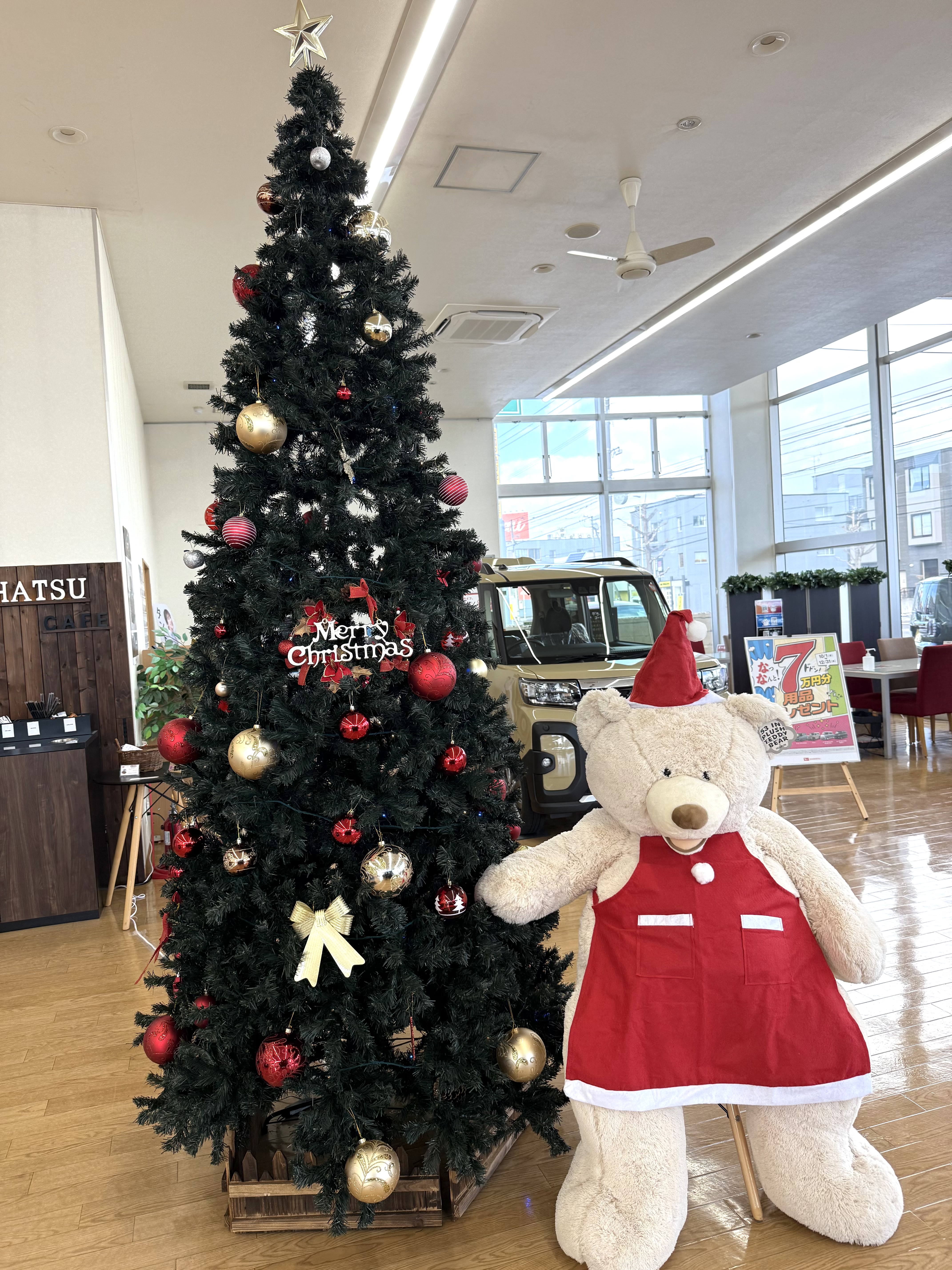 ショールームには大きなクリスマスツリーとサンタのクマちゃんが